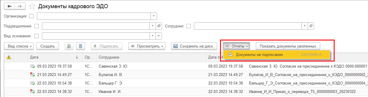 В списке документов кадрового ЭДО появился пункт "Показывать документы уволенных", по нему производится дополнительный отбор документов.