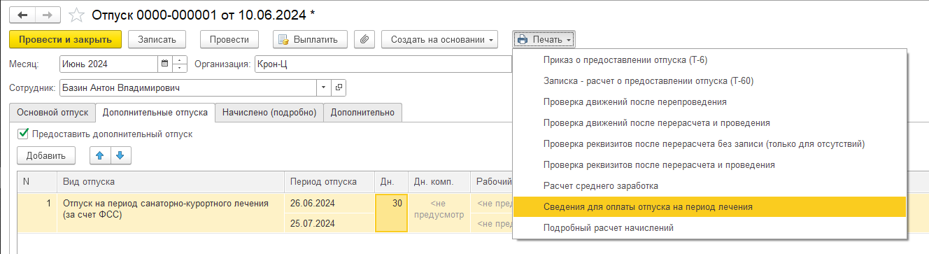 Печатная форма "Сведения для оплаты отпуска на период лечения" добавлена в документ "Отпуск" (когда в документе выбран дополнительный отпуск на период лечения).