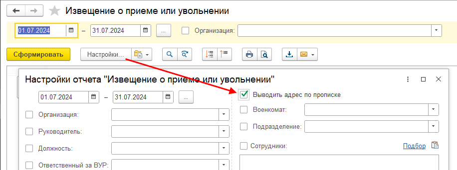 В отчет "Извещение о приеме или увольнении" добавлена настройка "Выводить адрес по прописке".