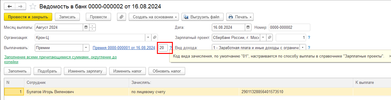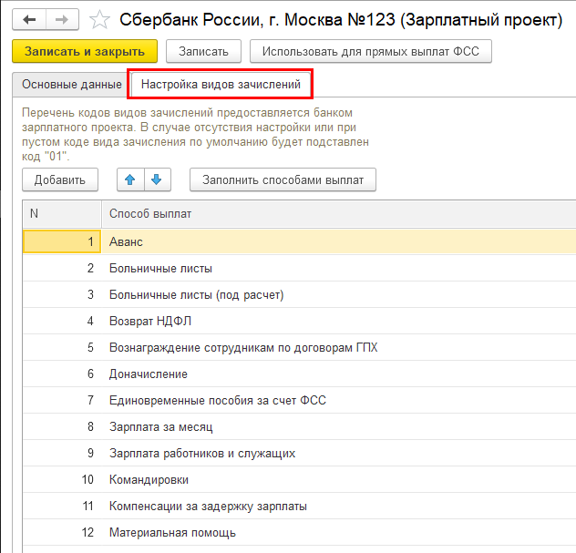 Добавлена возможность при обмене с банками по зарплатным проектам передать в реестре произвольный код вида зачисления. Используемые виды зачислений настраиваются в карточке зарплатного проекта и выбираются в ведомости.
