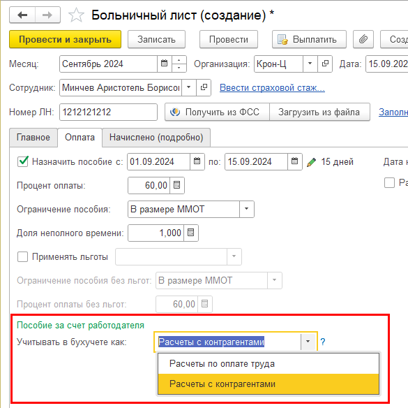 В больничном листе с видом нетрудоспособности "Заболевание" или "Травма" добавлена возможность выбора варианта отражения в бухучете пособия за счет работодателя, при условии, что на дату начала события нет действующего трудового договора и есть действующий договор ГПХ.