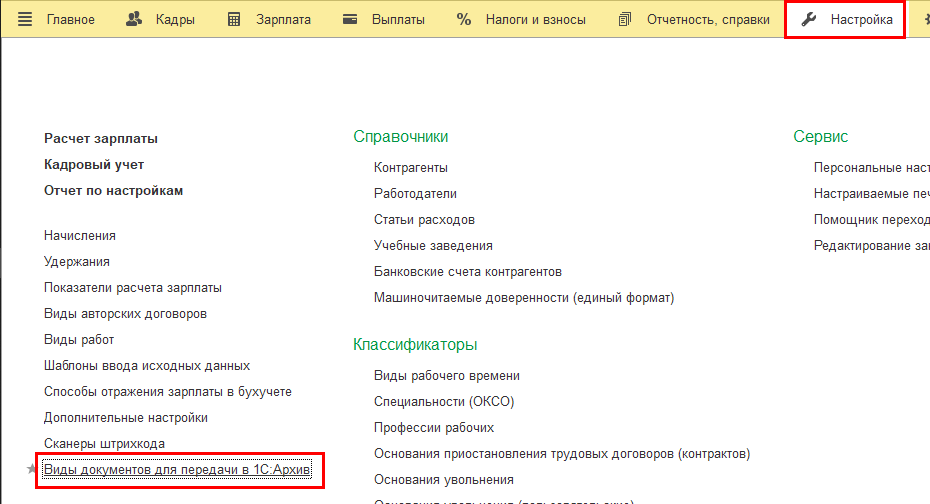 Затем можно проверить и донастроить поставляемые "Виды документов для передачи в 1С:Архив" в разделе Настройка.