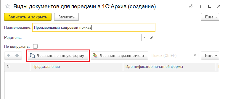Для добавления внешней печатной формы в новом или существующем виде документа добавьте интересуемую печатную форму: