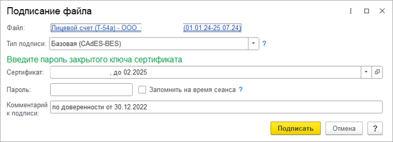 Выберите подпись, при необходимости заполните Комментарий к подписи.