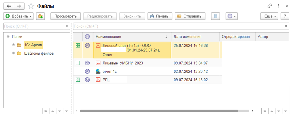 Также в разделе Администрирование – Файлы на панели слева появляется группа "1С:Архив", в которую будут сохраняться варианты отчетов для выгрузки в Архив. При выключении интеграции эта папка помечается на удаление, если в ней нет файлов.