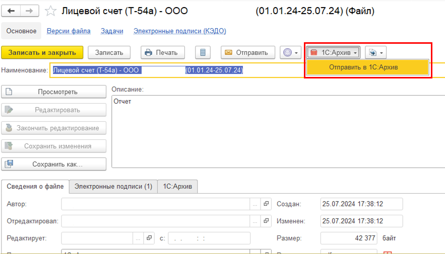 При передаче печатной формы в сервис "1С:Кабинет сотрудника" файл также присоединяется к документу. У него аналогично определяются вид документа, организация, дата, номер. Но при выгрузке в 1С:Архив дополнительно в документе архива заполняется: