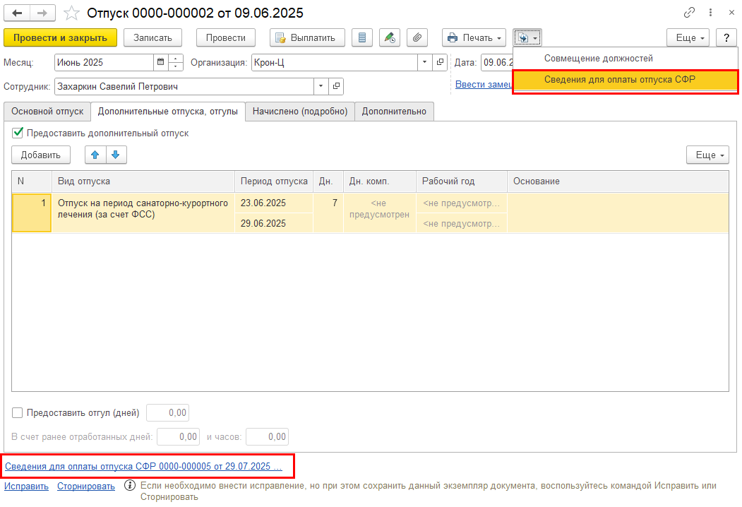 Сведения создаются на основании отпуска. В документ с видом отпуска "Отпуск на период санаторно-курортного лечения (за счет ФСС)" добавлена команда создания документа "Сведения для оплаты отпуска СФР" на основании. В нижней части документа теперь отображаются последние созданные сведения по отпуску.