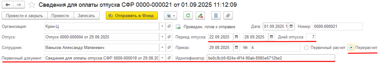 Новый документ "Сведения для оплаты отпуска СФР" имеет следующие основные особенности: