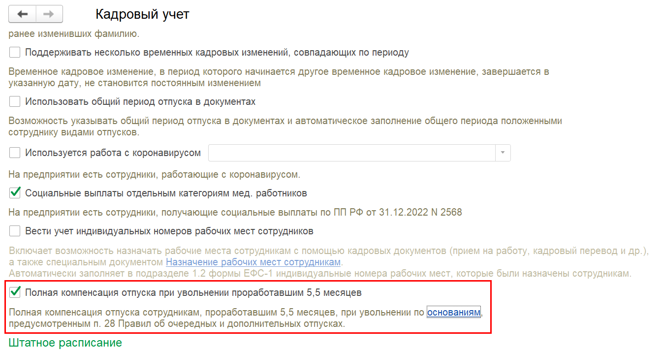В настройки кадрового учета добавлена настройка "Полная компенсация отпуска при увольнении проработавшим 5,5 месяцев". Там же можно просмотреть и отредактировать список оснований увольнения, при которых полагается такая компенсация.