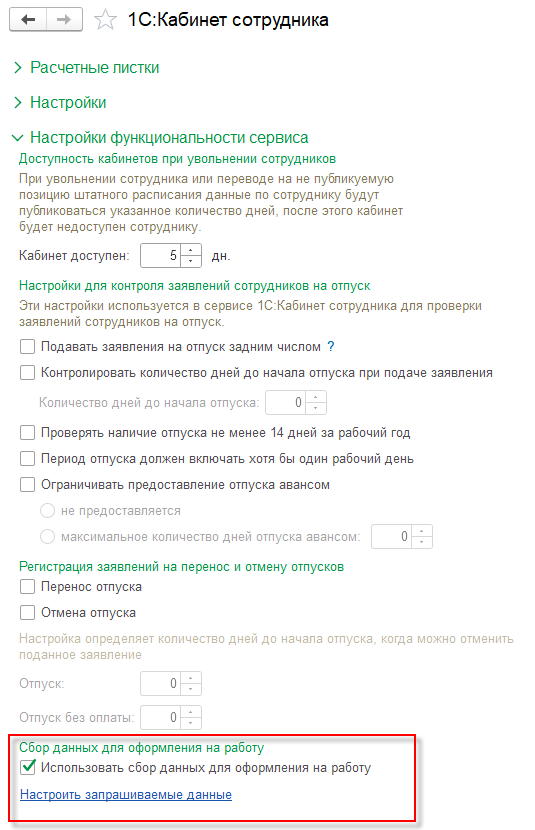Для использования этого функционала добавлена настройка "Использовать сбор данных для оформления на работу". По ссылке "Настроить запрашиваемые данные" открывается список данных, которые будут запрашиваться, можно сразу выключить запрос некоторых данных.