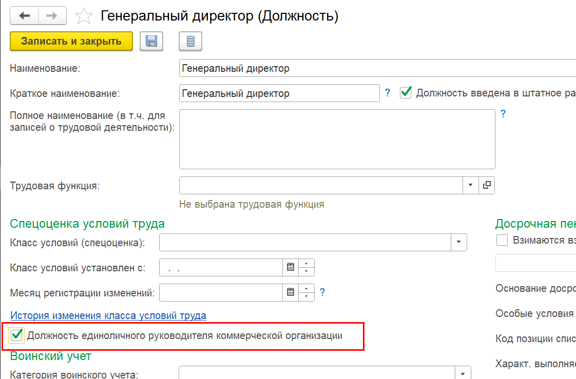 Для расчета страховых взносов руководителя в карточку должности добавлен флажок "Должность единоличного руководителя коммерческой организации"