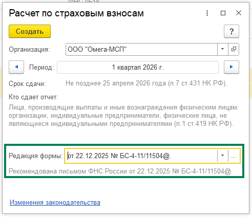 Выполнено обновление формы РСВ, согласно Письму ФНС от