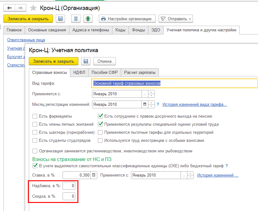Добавлена возможность указания скидки или надбавки к тарифу страховых взносов на НСиПЗ.