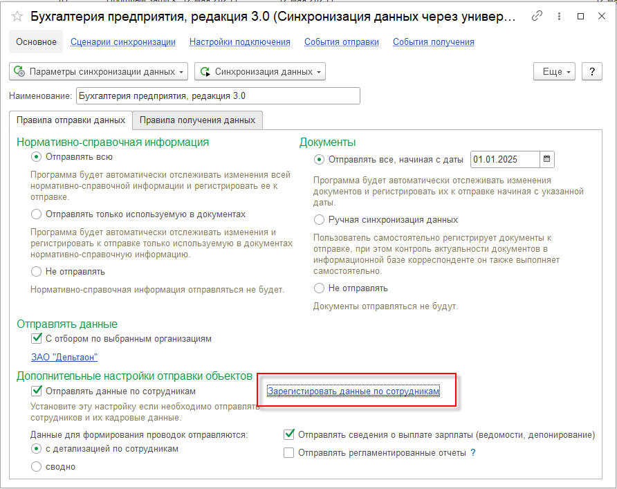 При включении выгрузки данных по сотрудникам в уже настроенном обмене в формате Enterprise data предоставлена возможность зарегистрировать уже имеющиеся данные по сотрудникам.