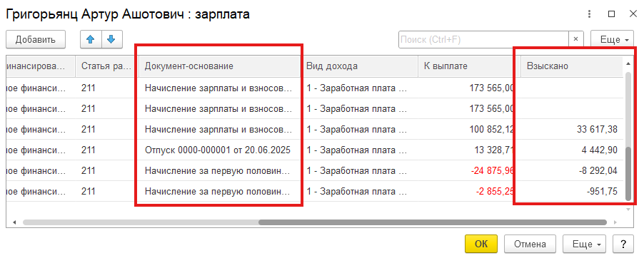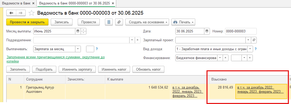 В новой версии выполнено изменение функционала по взысканным суммам. Теперь расшифровка по взысканным суммам более прозрачна: просмотреть взысканную сумму можно по документам-основаниям прямо в выплате (по принципу просмотра сумм "К выплате").