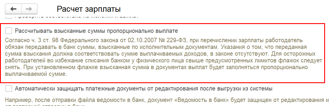Также добавлен флаг "Рассчитывать взысканные суммы пропорционально выплате" в настройках расчета зарплаты, который позволяет выбирать: показывать все суммы удержанного в качестве взысканного в каждой ведомости (избегая завышения этих сумм) или заполнять взысканные суммы в разрезе статей финансирования, статей затрат и пропорционально выплате.