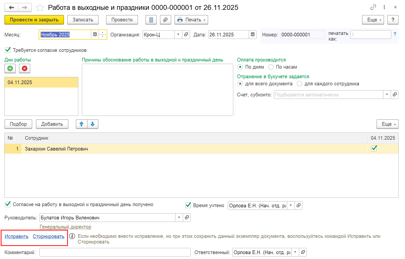 Добавлена возможность сторнирования и исправления документов "Работа в выходные и праздники", "Работа сверхурочно".