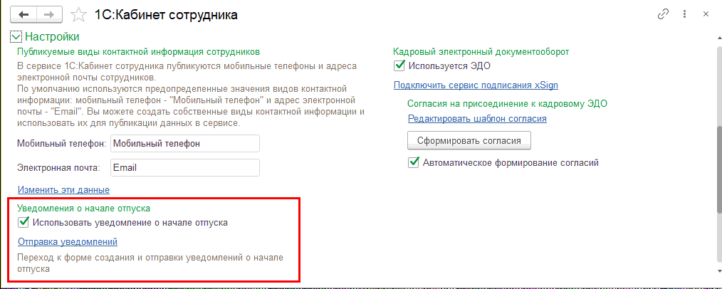 Добавлена соответствующая настройка и ссылка для открытия формы рабочего места "Отправка уведомлений о начале отпуска". После включения настройки она также доступна в разделе Кадры - Сервис.
