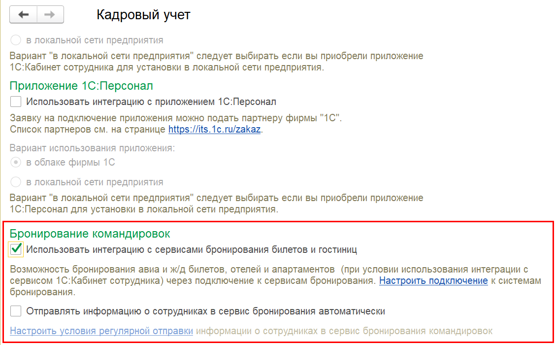Теперь при включенной интеграции с сервисом становится доступен весь функционал бронирования командировок.