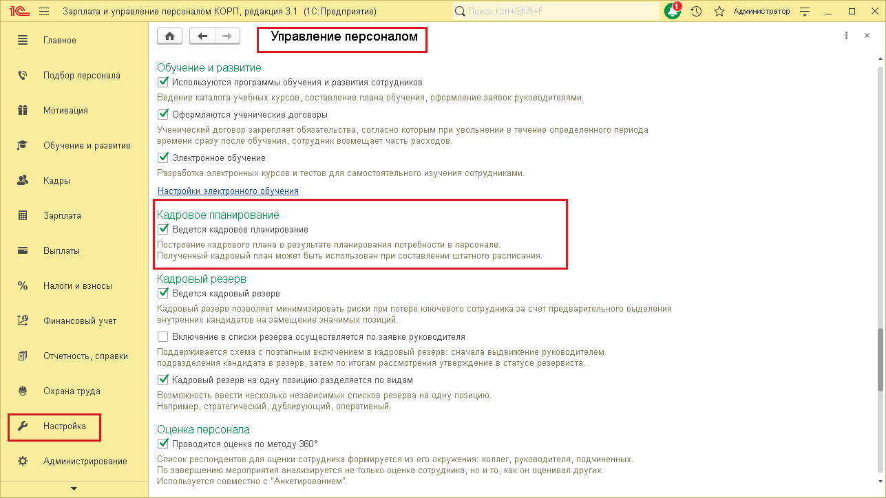 Опцию Ведется кадровое планирование Администратор включает в Настройка/Управление персоналом.