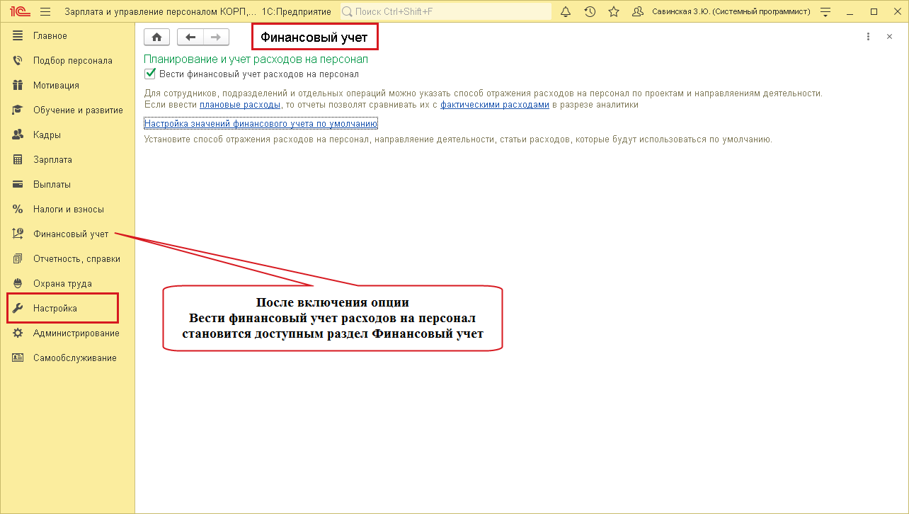Администратор включает опцию Вести финансовый учет расходов на персонал в разделе Настройка/Финансовый учет.