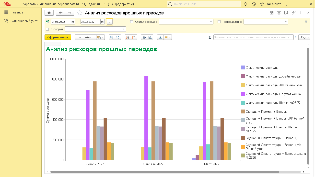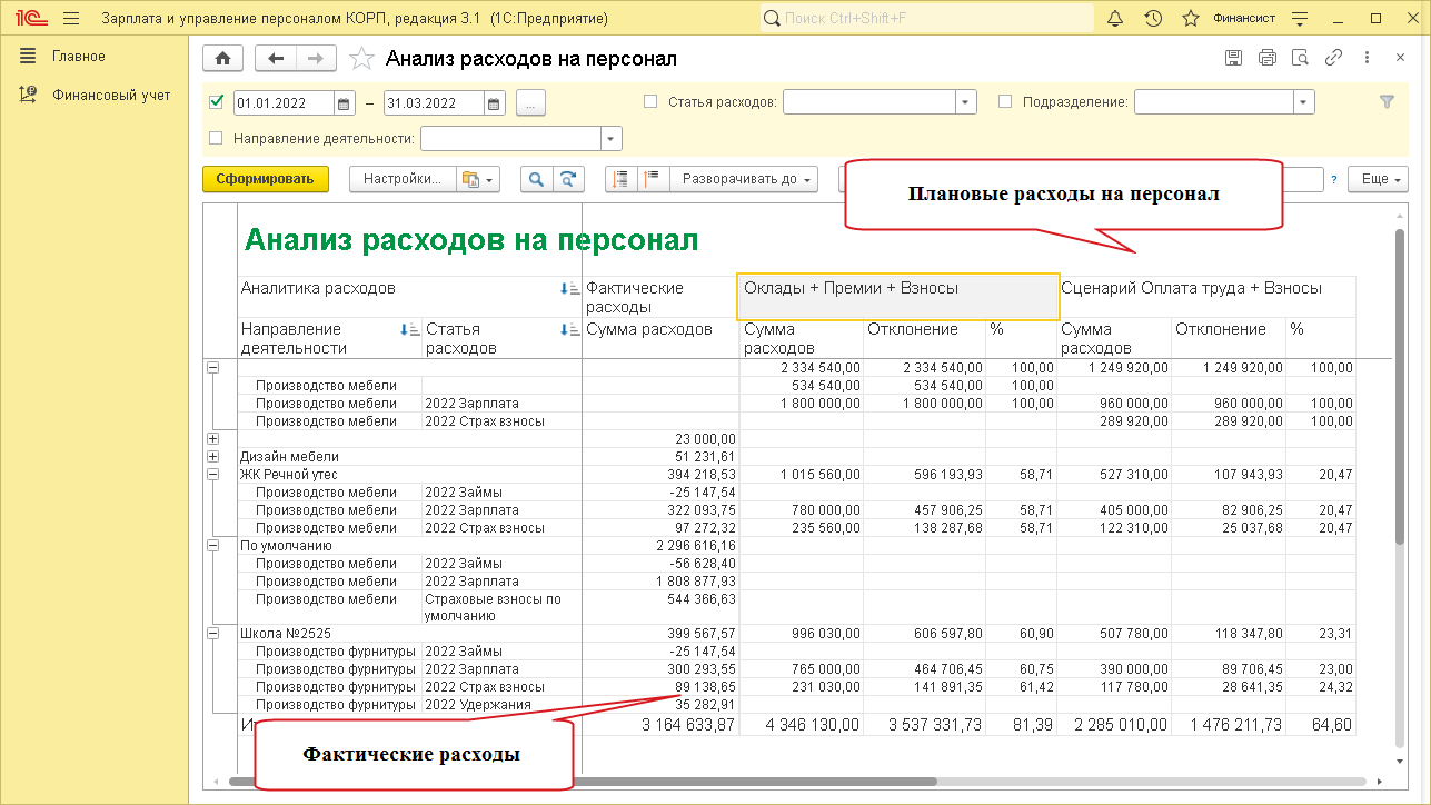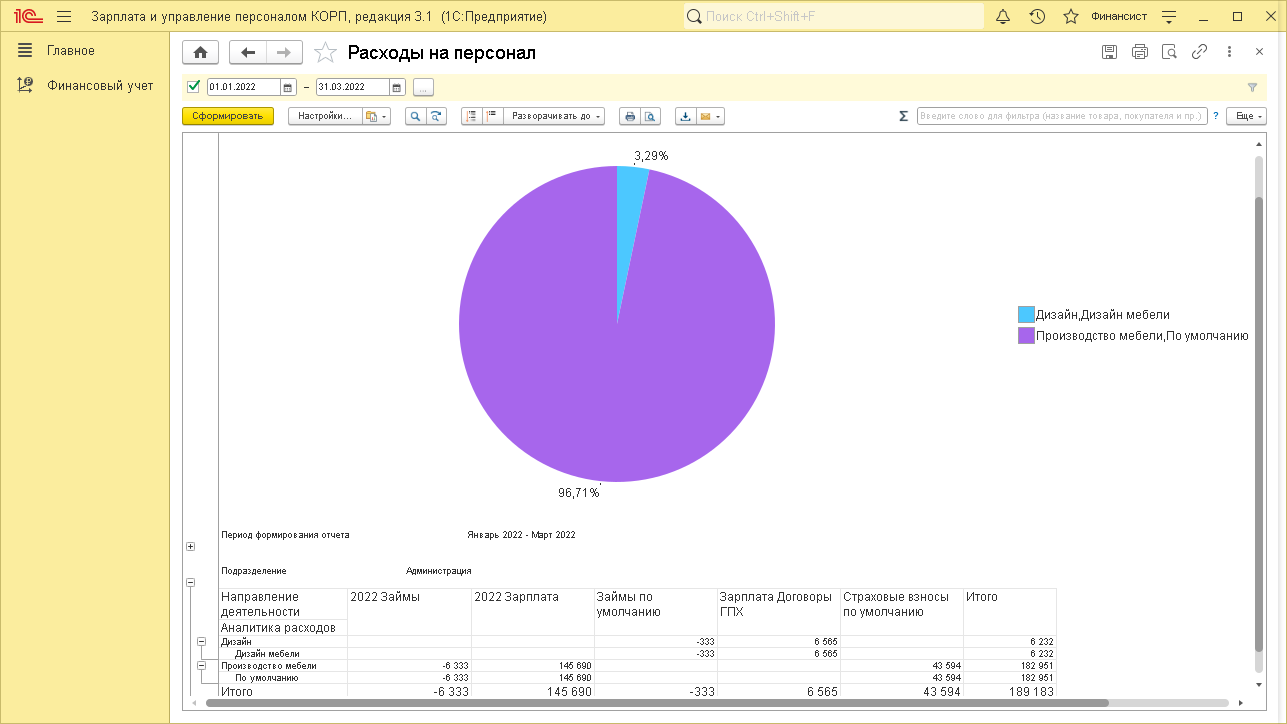 Отчет выводит за период диаграмму и таблицу фактических расходов на персонал в разрезе: