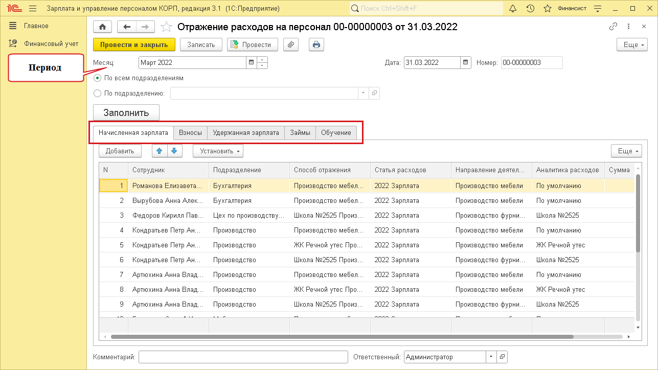 Уникальность финансового учета в ЗУП КОРП в том, что он позволяет определить, какие расходы на зарплату, страховые взносы, обучение понесла компания на каждого сотрудника в разрезе всех проектов, над которыми он работает.
