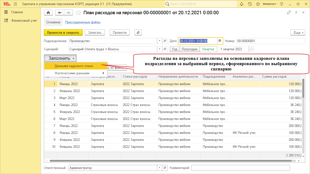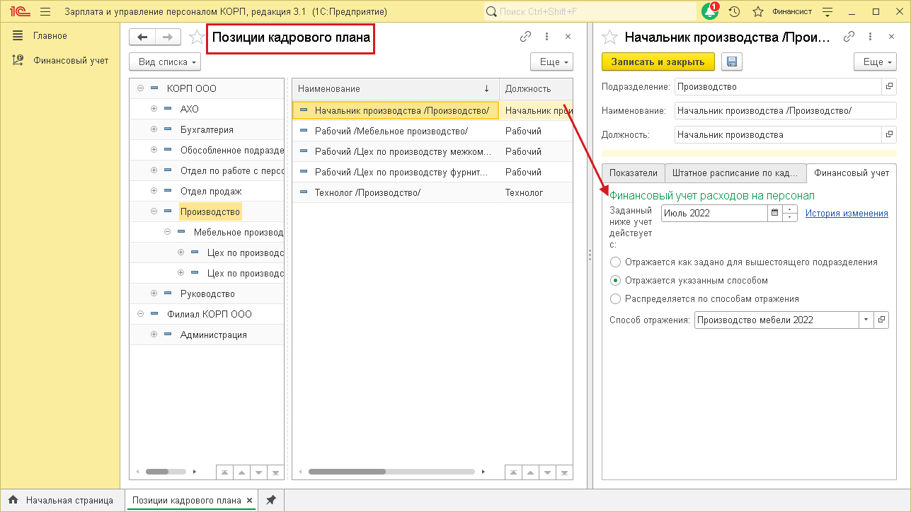 Если в 1С:ЗУП КОРП ведут кадровый план и планируют расходы на персонал, способ отражения расходов можно указать для позиции кадрового плана.