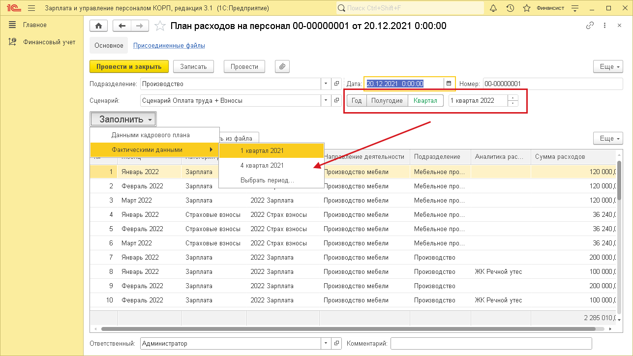 При заполнении плана расходов на персонал по фактическим данным аналитика финансового учета будет применяться таким образом: