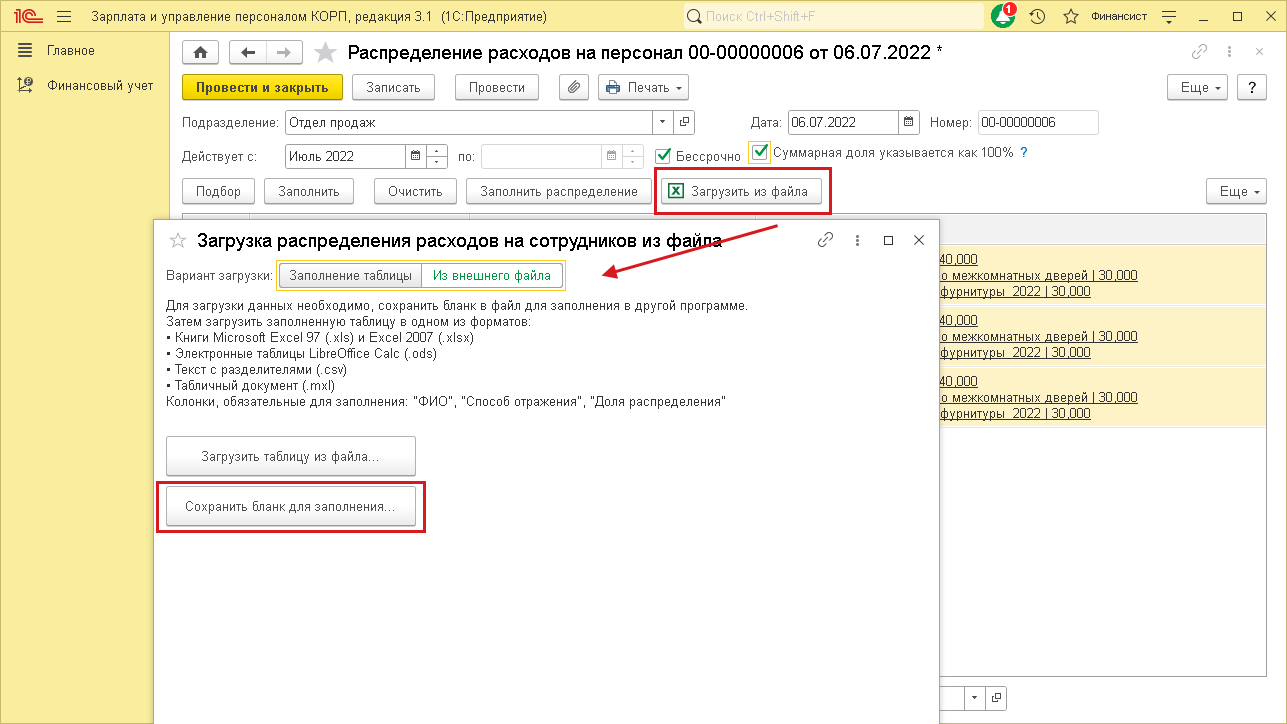Информацию о распределении расходов на персонал для финансового учета можно загрузить из внешнего файла в формате Ms Excel. Шаблон файла предварительно выгружают из программы.
