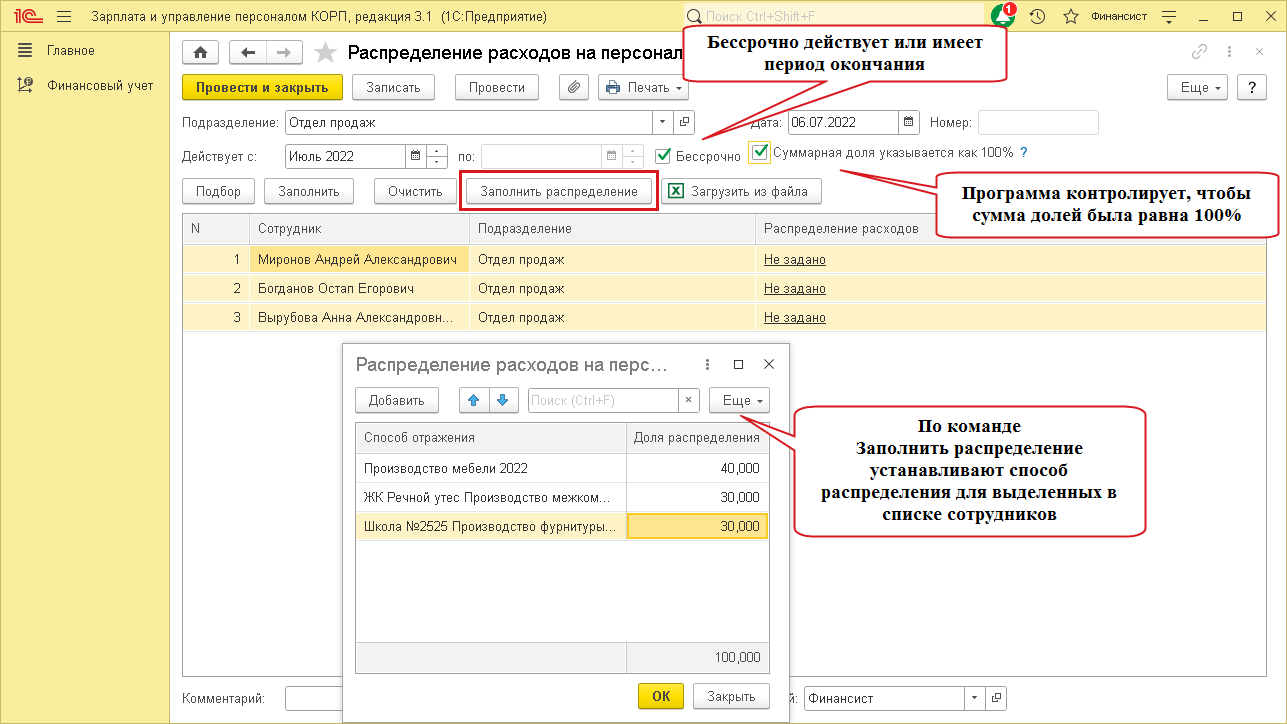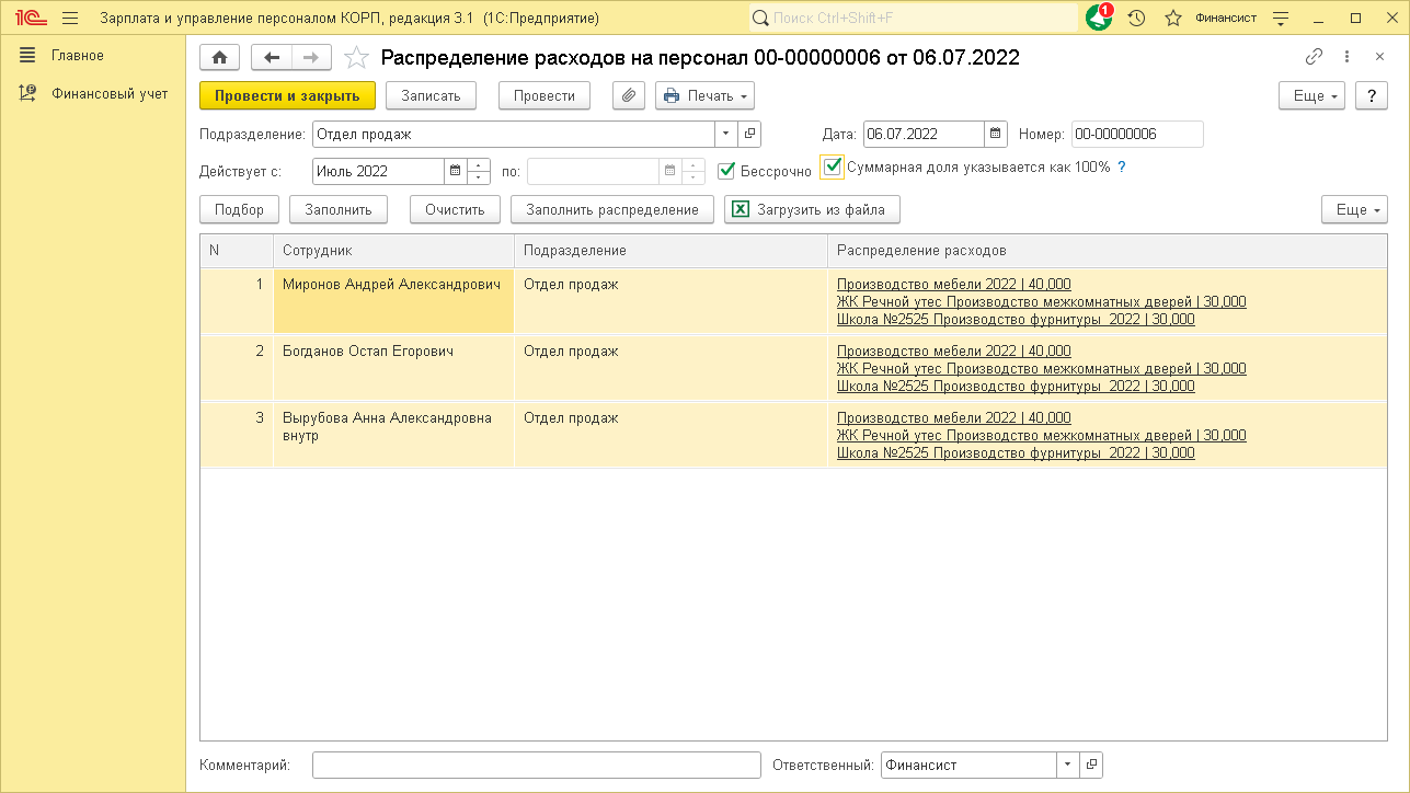 Например, сотрудникам отдела продаж, начиная с июля, бессрочно установлено одинаковое распределение расходов.