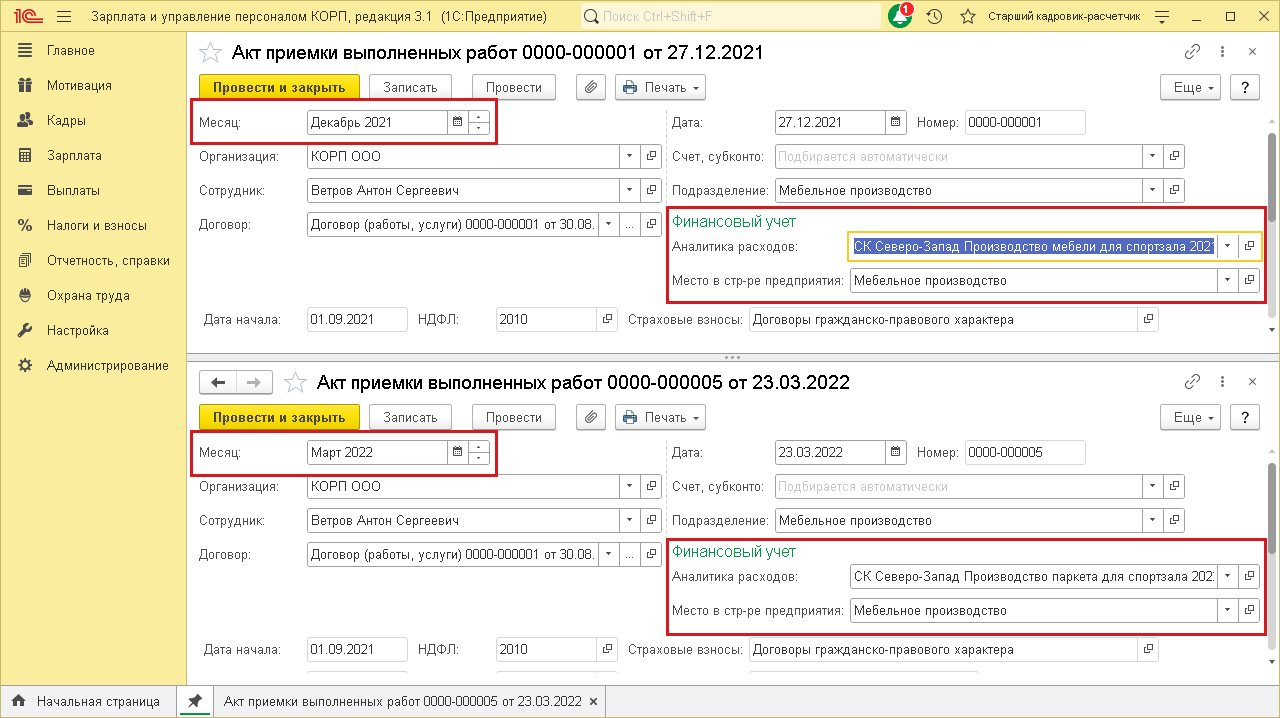Договор подряда заключен с сентября 2021 года по март 2022 года. Оплата производится по актам выполненных работ. Первый акт был закрыт в декабре 2021 года, и расходы по нему нужно отнести по направлению деятельности Производство мебели, проекту СК Северо-Запад и статьям расходов за 2021 год.