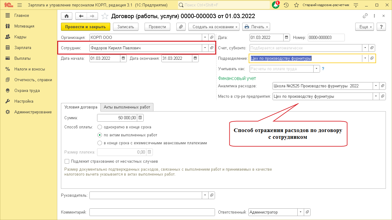 Если в документе Договор (работы, услуги) с сотрудником не указан способ отражения расходов в финансовом учете, расходы по такому договору будут отражаться тем же способом, что и для сотрудника.
