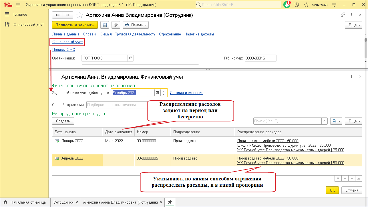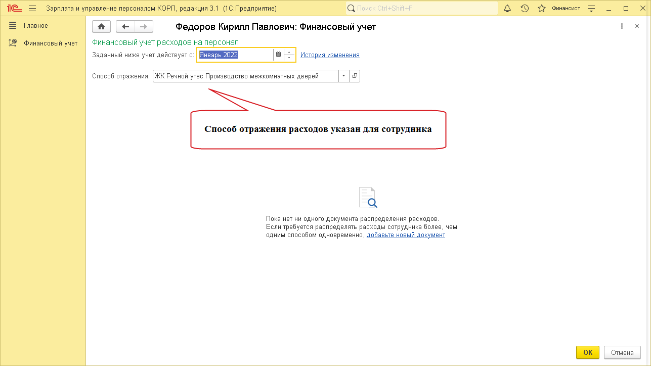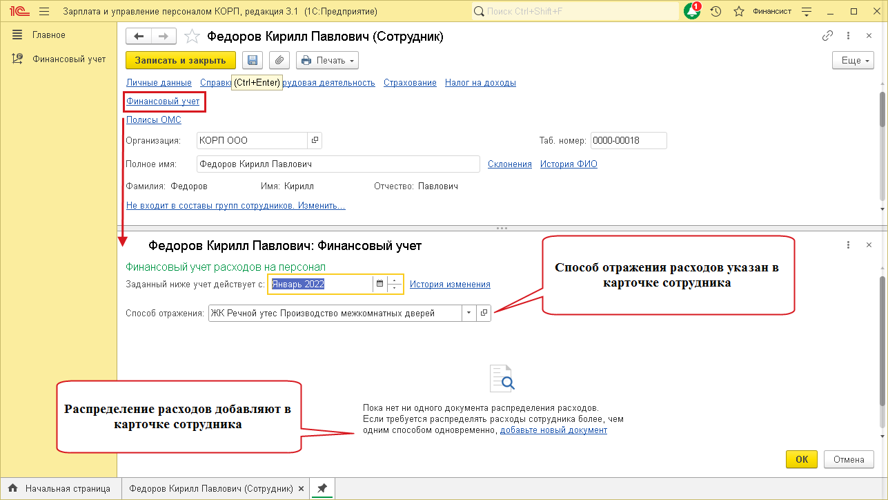 В таком случае способ отражения указывают в карточке сотрудника по гиперссылке Финансовый учет.