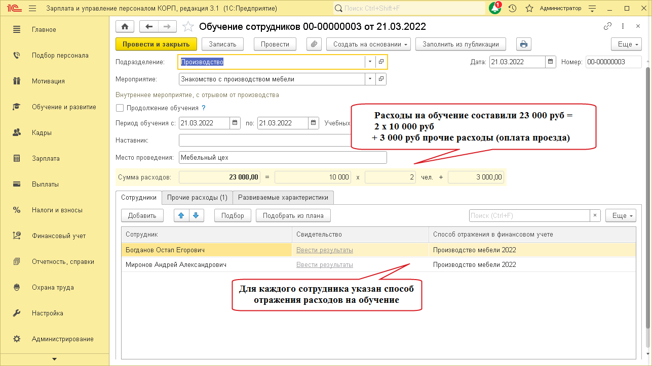 Стоимость их обучения составила 23 000 руб. В эту сумму вошла стоимость обучения двух человек по 10 000 руб. за каждого слушателя. На вкладке Прочие расходы указано, что слушателям оплачен проезд стоимостью 3 000 руб.