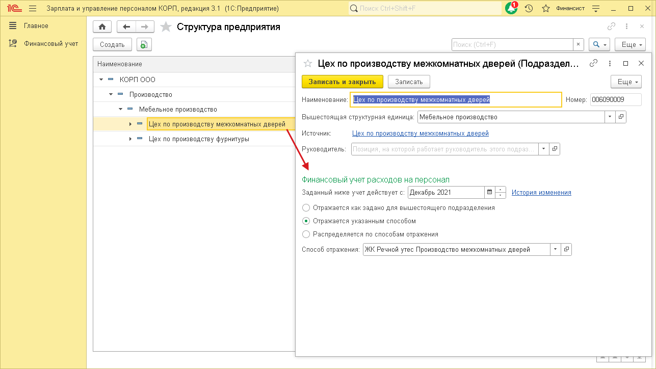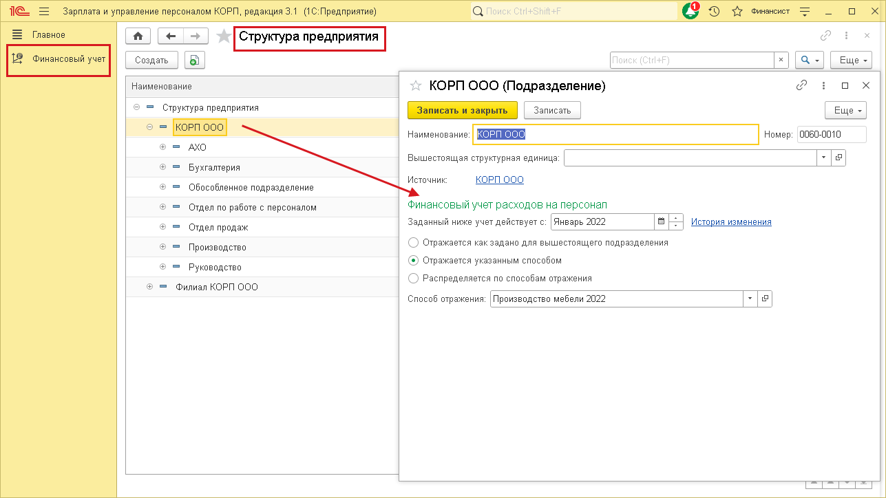 Способ отражения расходов на персонал организации настраивают в карточке Структуры предприятия.