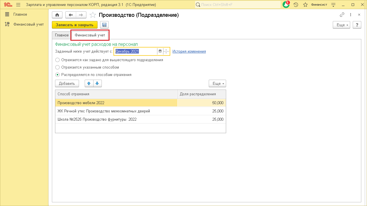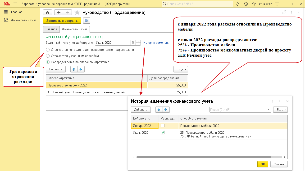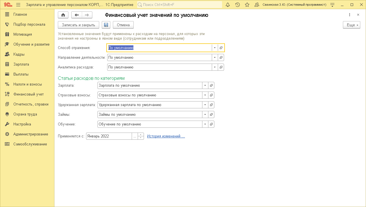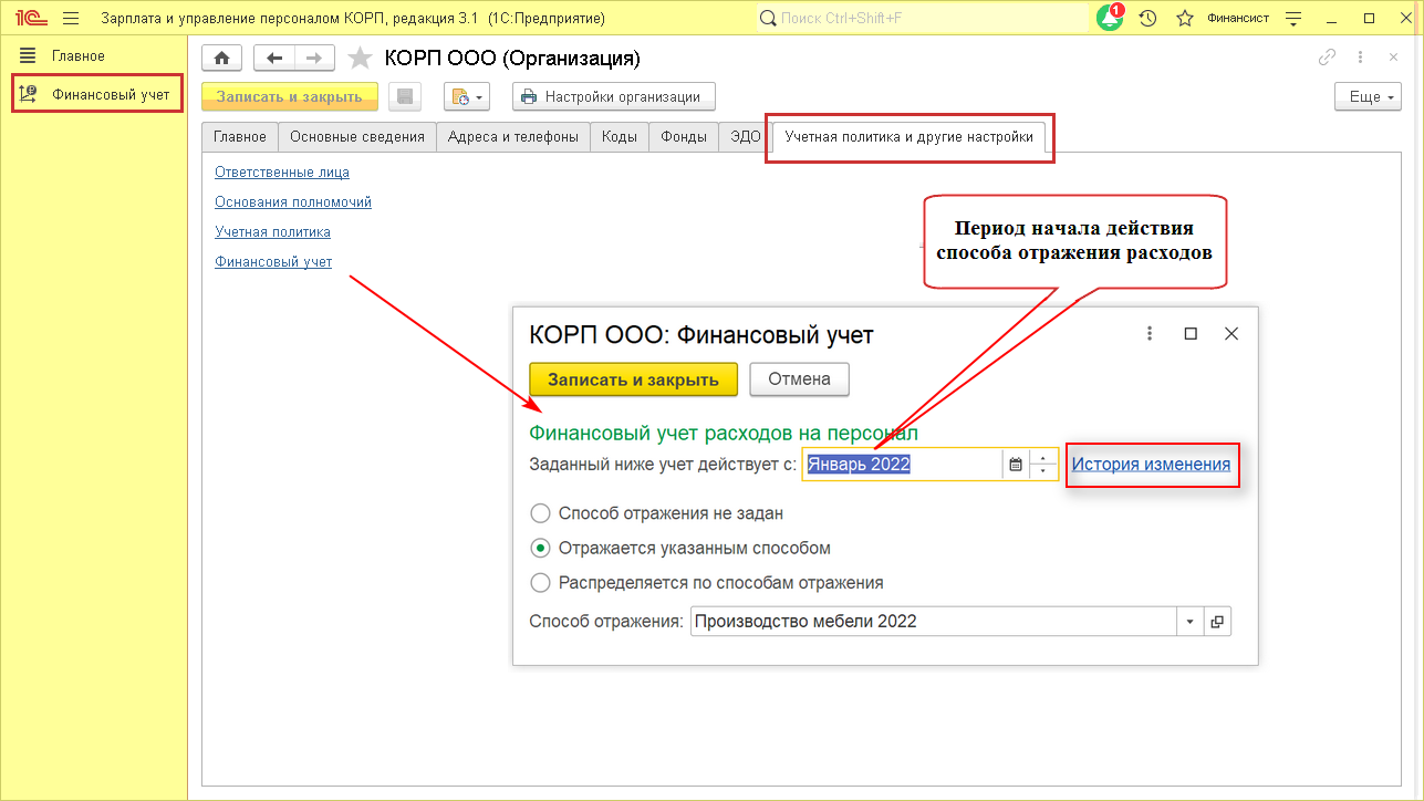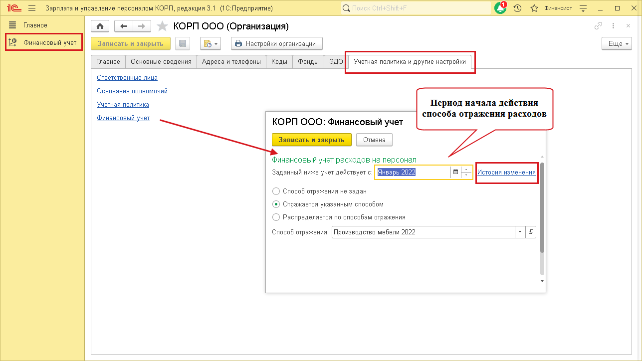 Для способа отражения расходов организации указывают, с какого периода он действует. История изменения способов отражения расходов на персонал доступна по одноименной гиперссылке.