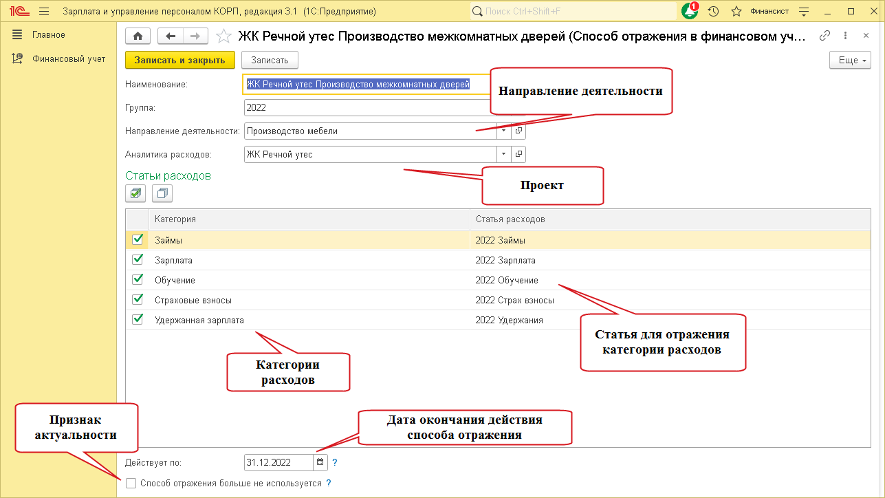 Если категория не отмечена флажком, расходы по ней в финансовом учете отражаются по статье По умолчанию.