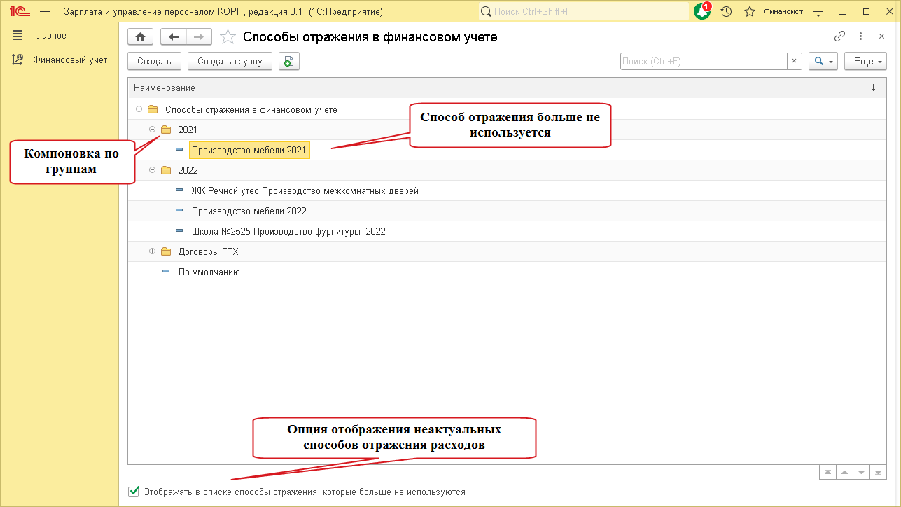 Способы отражения, которые больше не используют в учете, помечают соответствующим признаком. Они будут скрыты в списке. Если установить опцию Отображать в списке способы отражения, которые больше не используются, неактуальные способы видны как зачеркнутые.