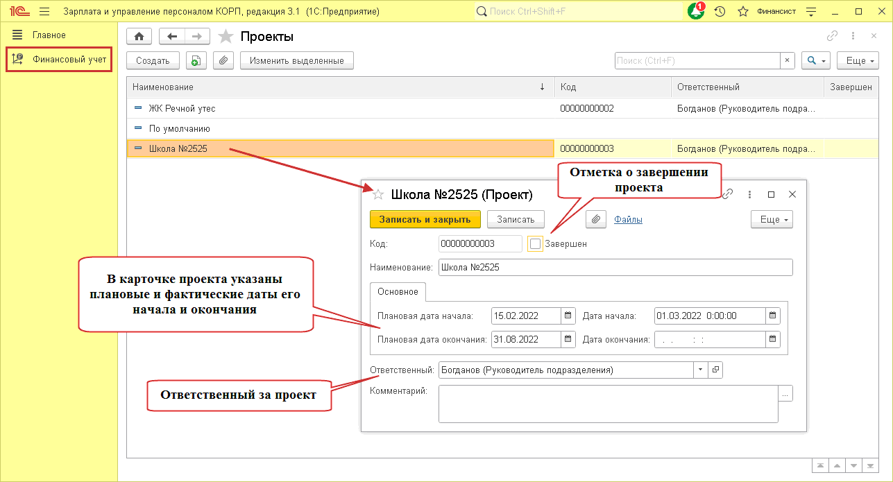 Проекты регистрируют в списке Финансовый учет/Проекты.