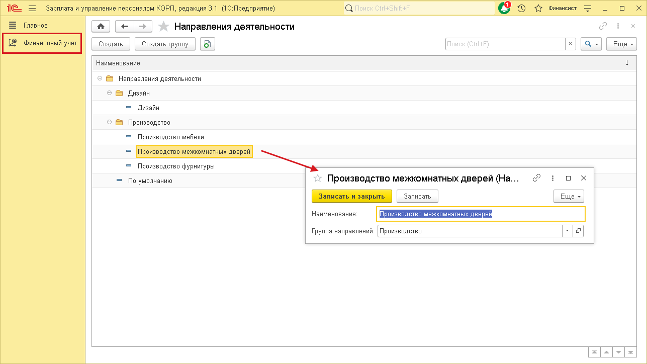 Список Направлений деятельности компании отражают в разделе Финансовый учет. Направления деятельности можно объединять в группы.