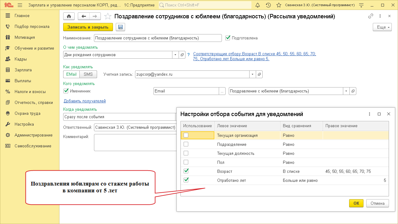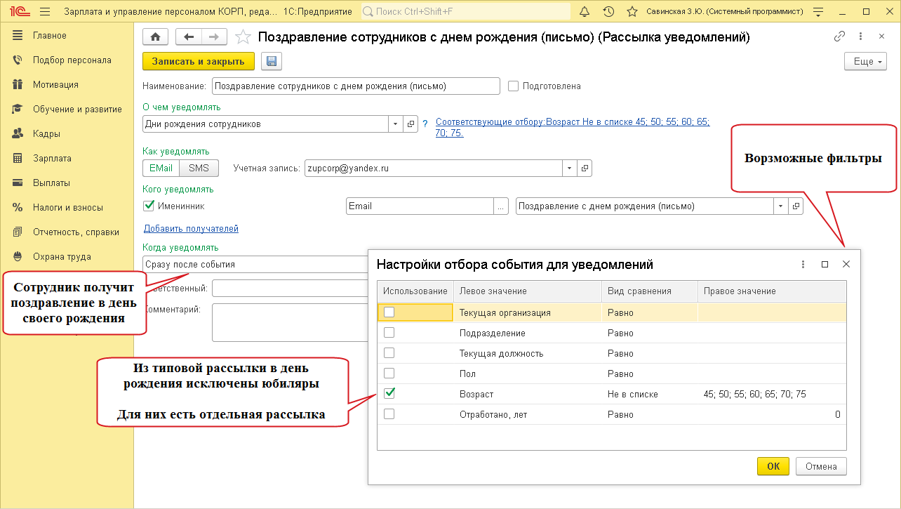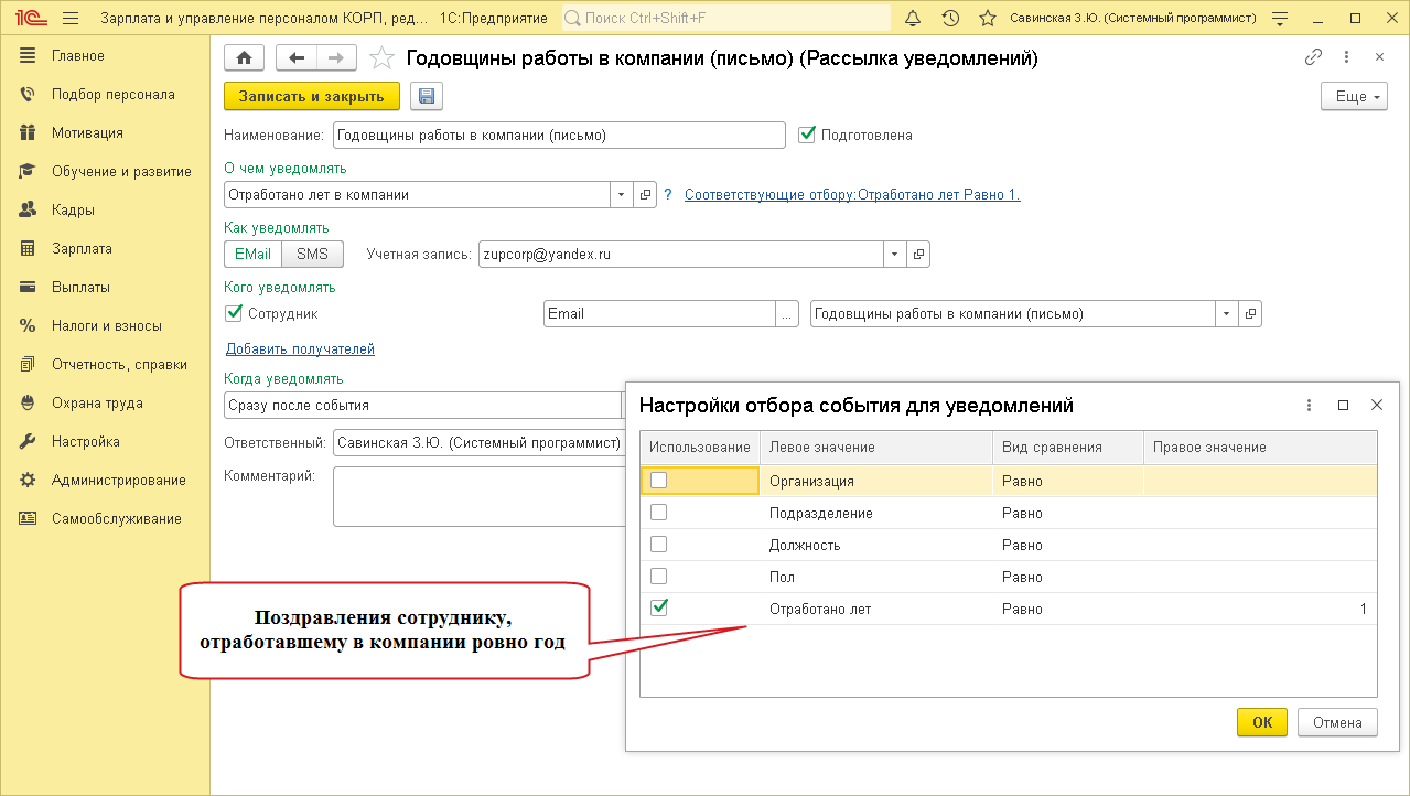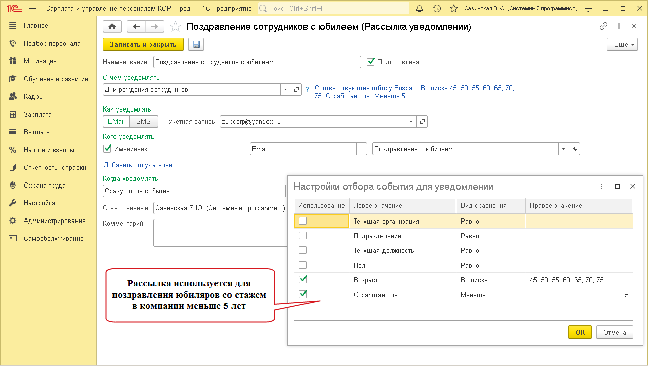 В 1С:ЗУП КОРП есть возможность автоматической отправки писем или SMS по правилу, по шаблону кандидатам или сотрудникам.