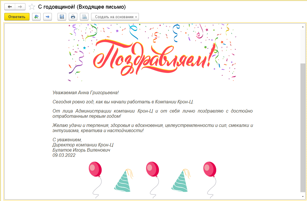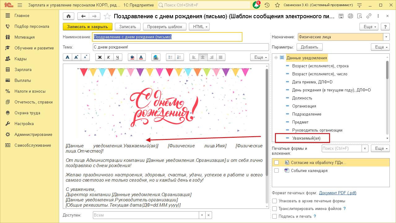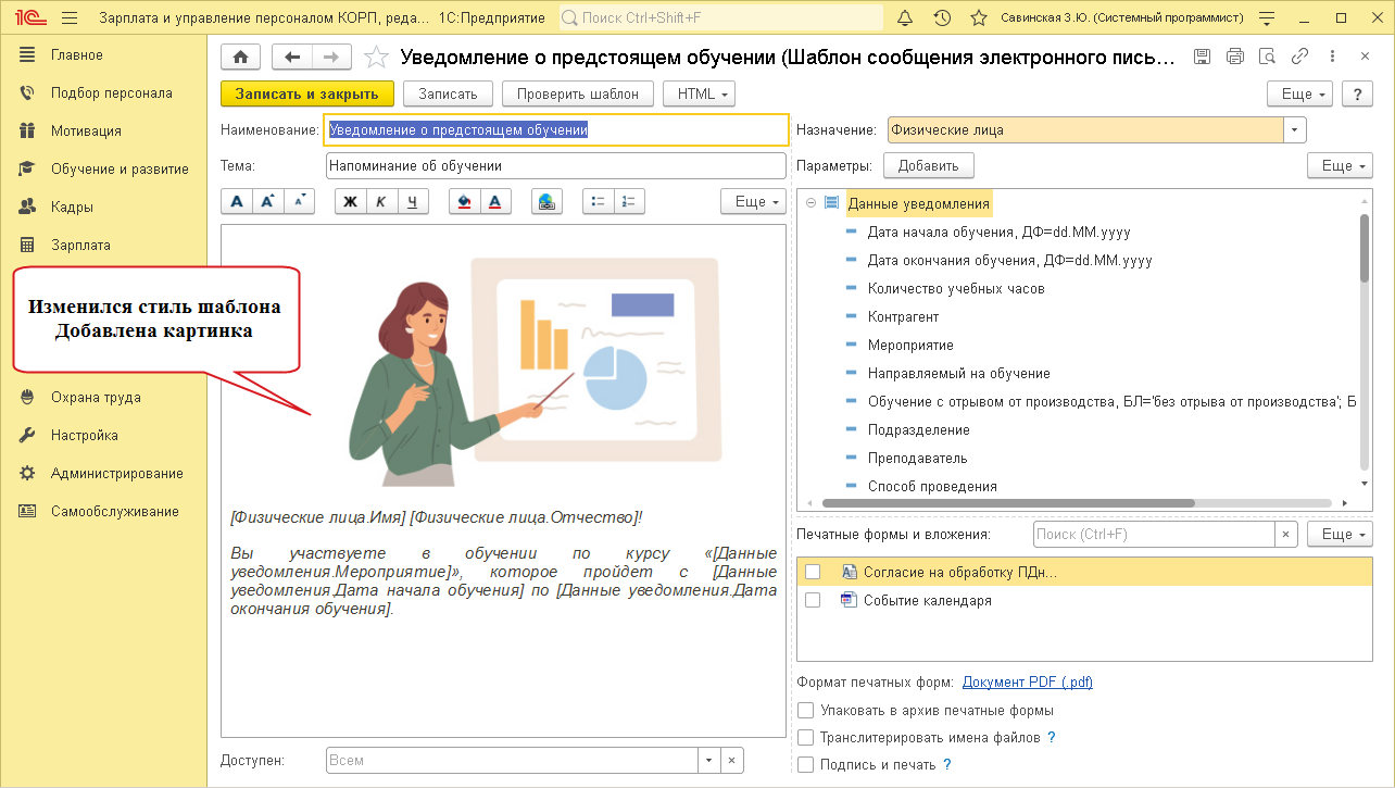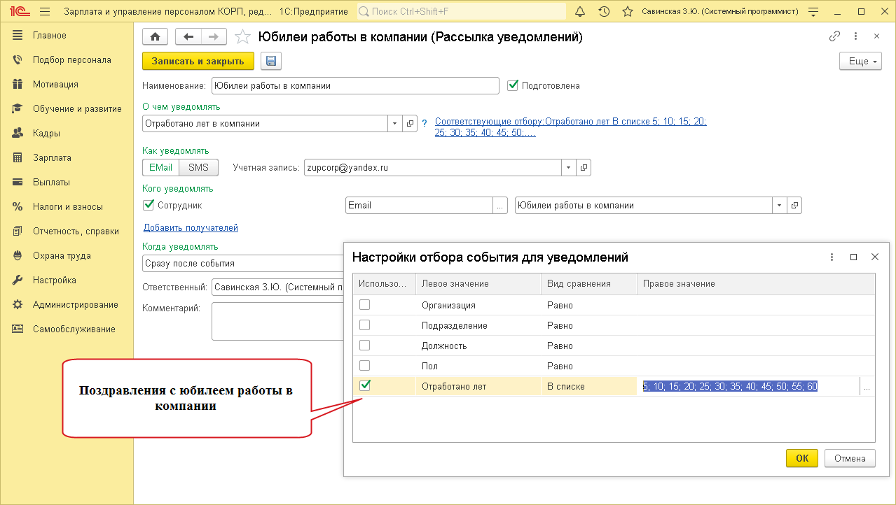 В 1С:ЗУП КОРП есть возможность автоматической отправки писем или SMS по правилу, по шаблону кандидатам или сотрудникам.