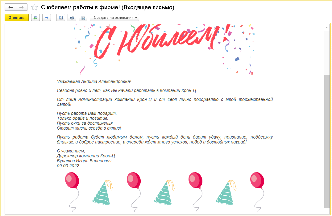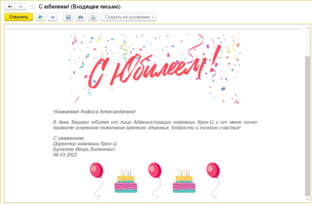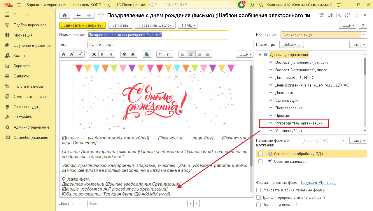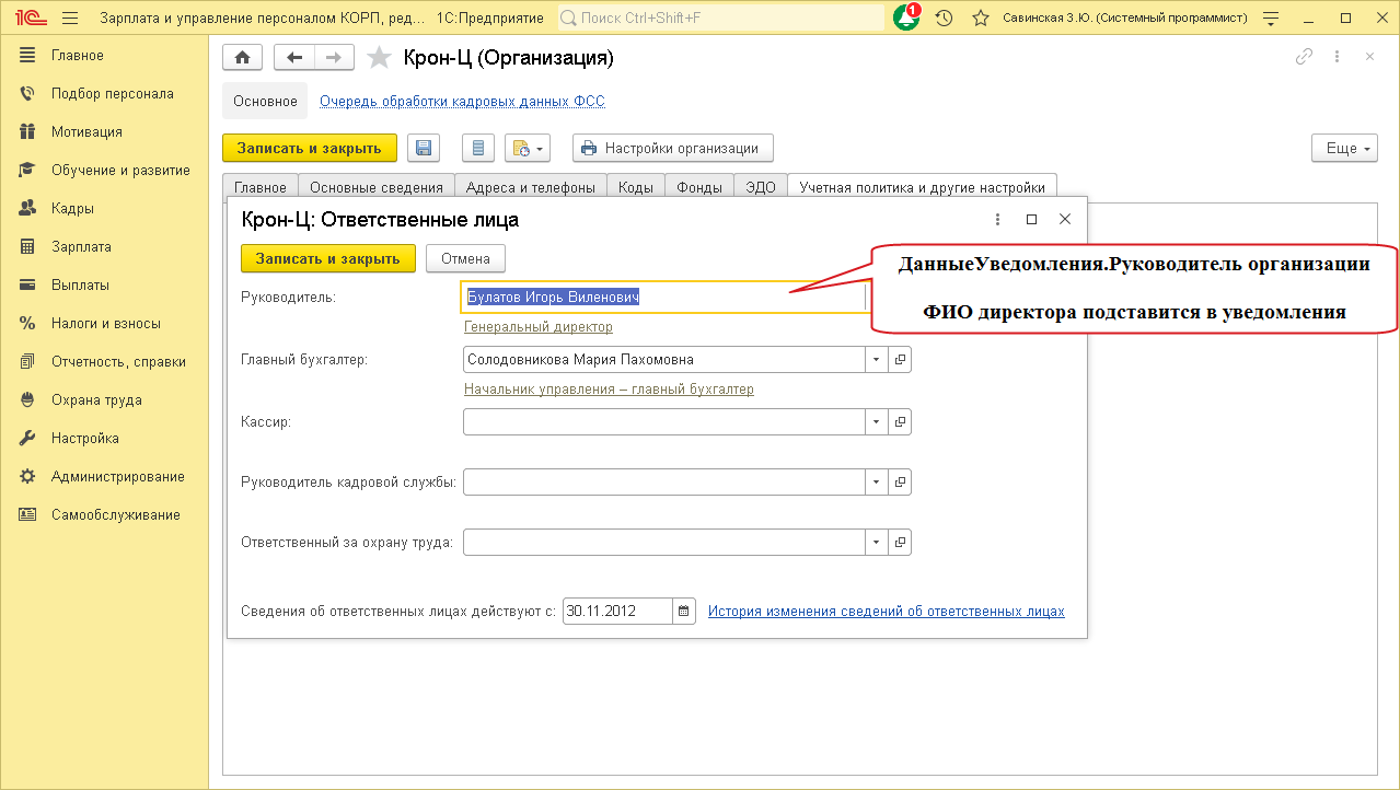 При смене руководителя организации в сообщениях по шаблону автоматически подставляется ФИО нового руководителя.