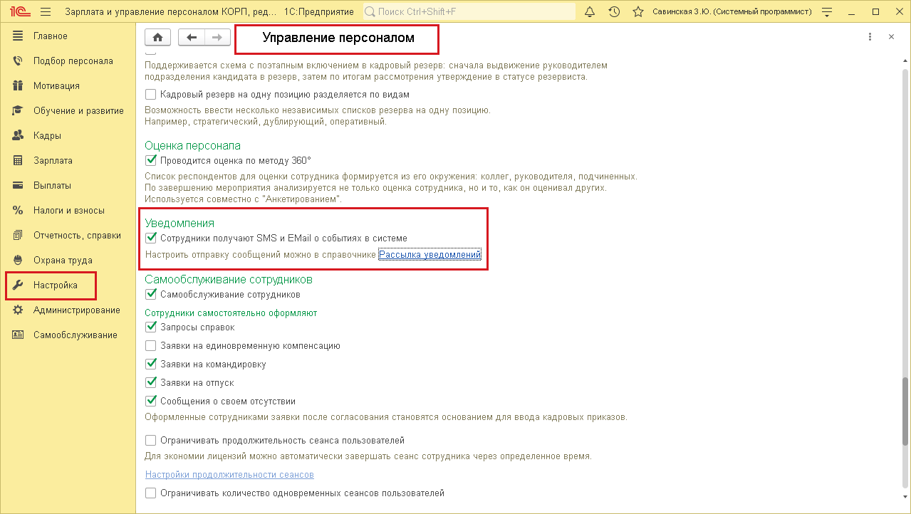 Чтобы начать пользоваться автоматическими рассылками уведомлений, в Настройка/Управление персоналом Администратор включает опцию Сотрудники получают SMS и Email о событиях в системе.