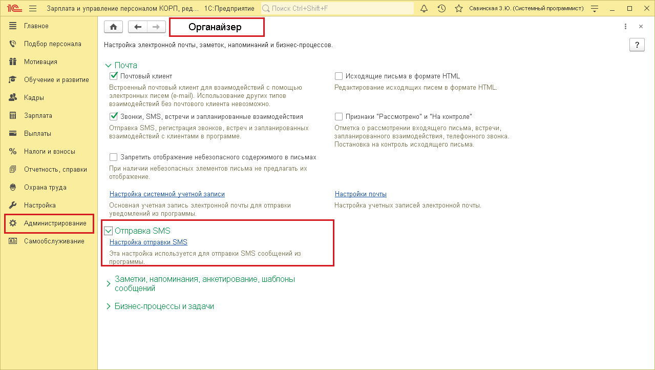 Если планируется отправлять уведомления в SMS, необходимо приобрести пакет услуг провайдера сотовой связи и выполнить Администрирование/Органайзер/Настройка отправки SMS. Стоимость SMS, отправленных 1С:ЗУП КОРП, списывается согласно тарифу оператора.