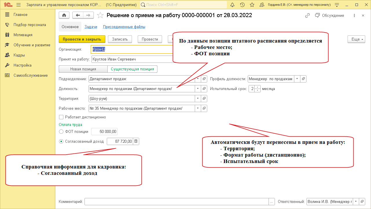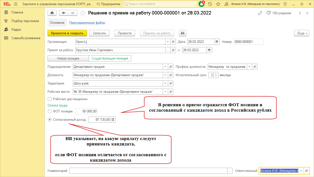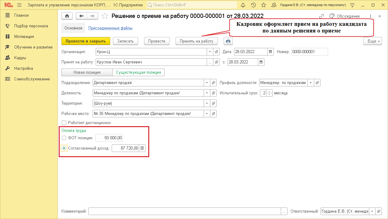 При оформлении Приема на работу на основании Решения о приеме Кадровик учитывает информацию о согласованном с кандидатом доходе.
