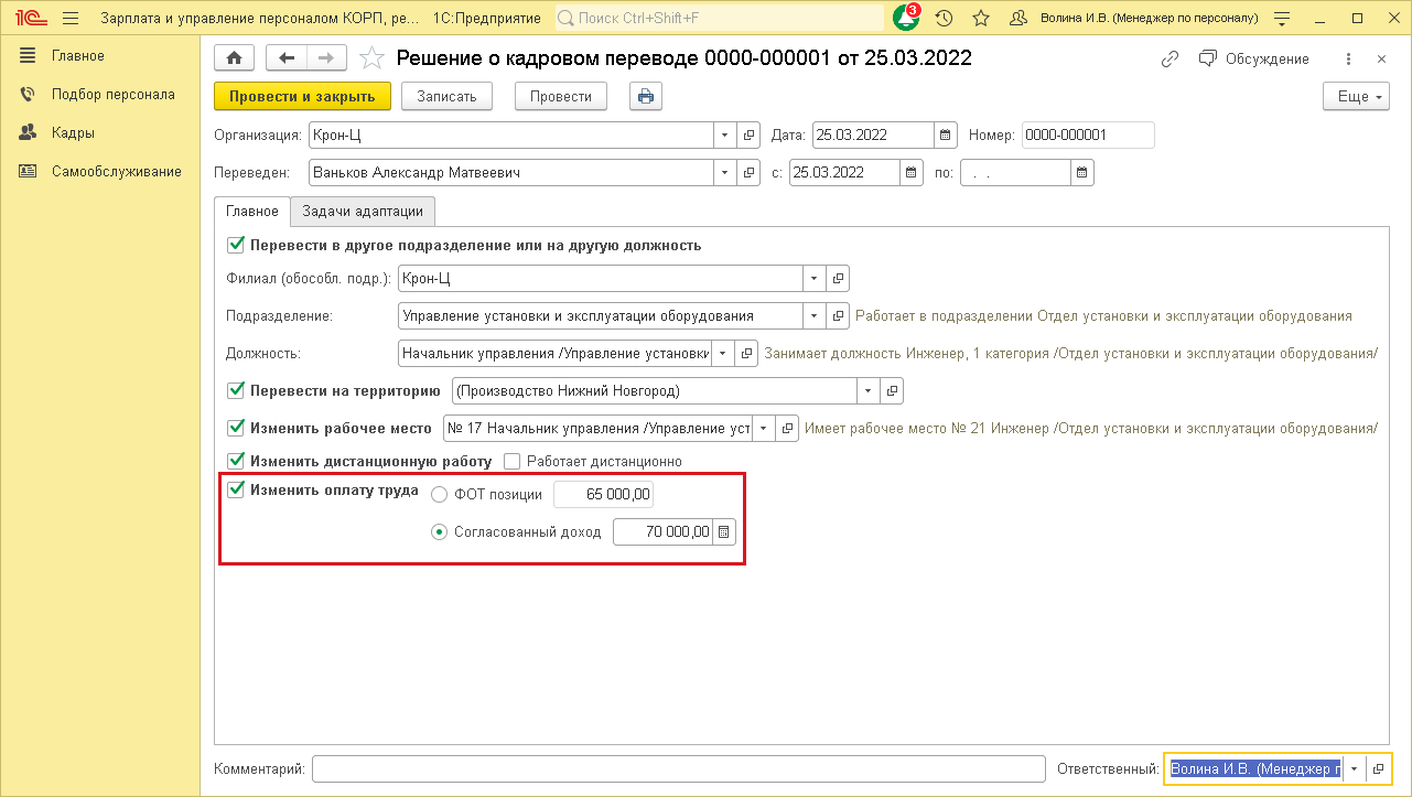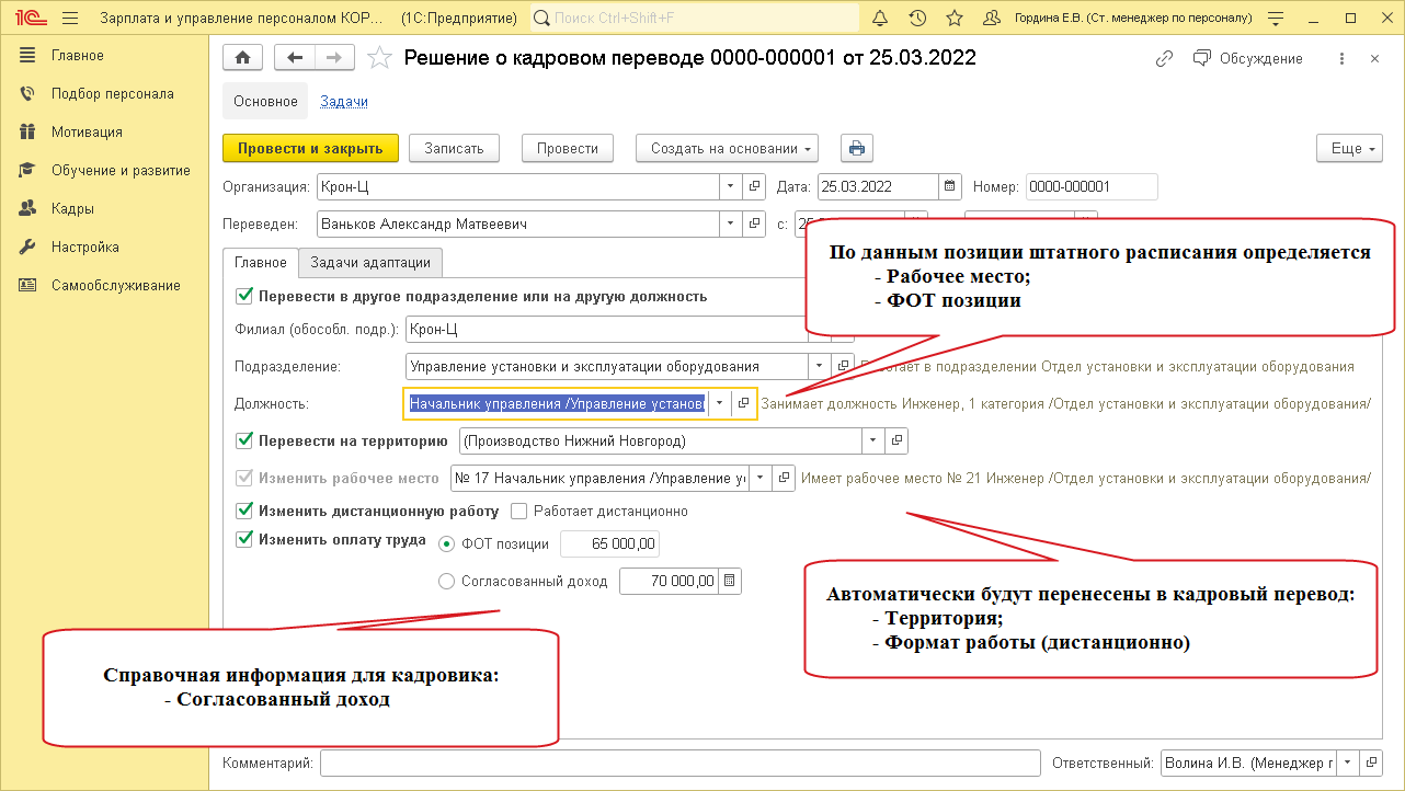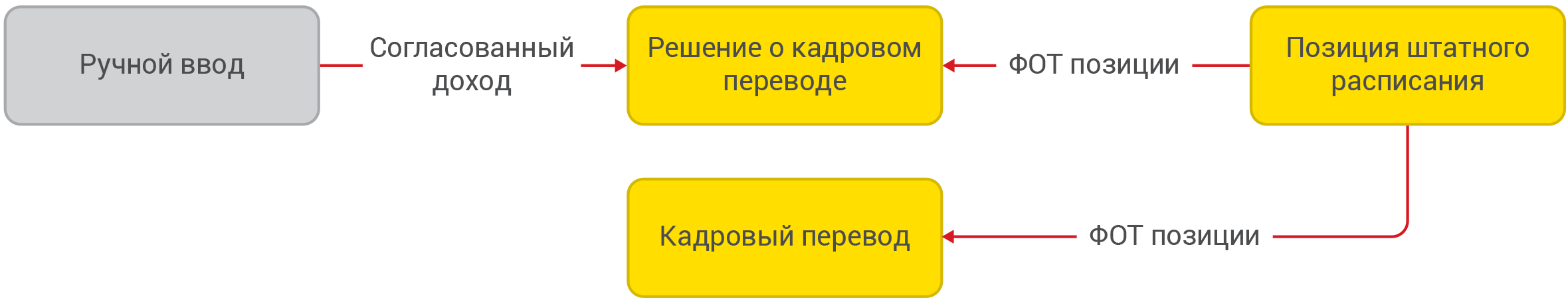 Аналогичная ситуация может возникнуть при кадровом переводе сотрудника. В 1С:ЗУП КОРП в решении о кадровом переводе указывают согласованный с сотрудником доход.