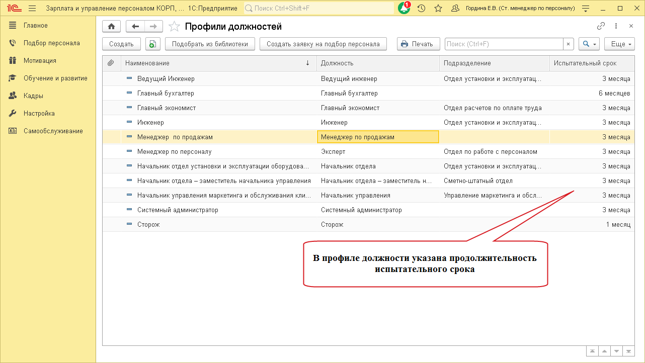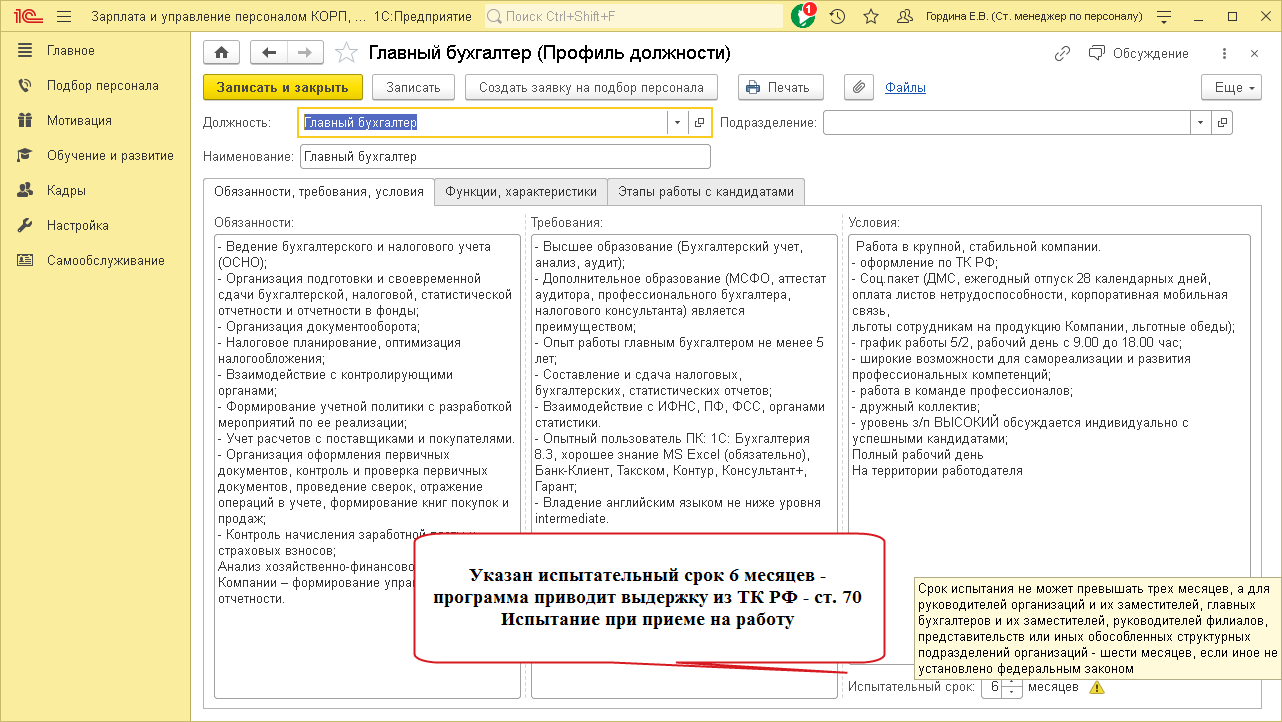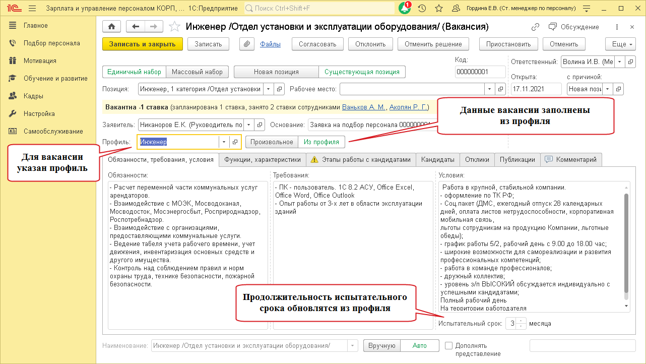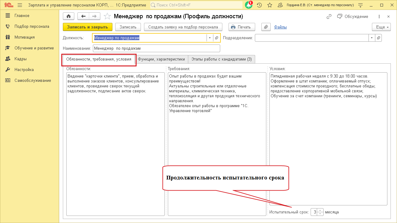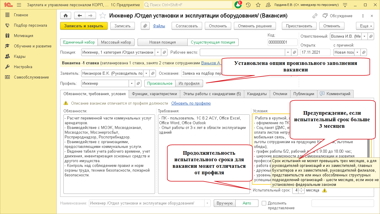Когда начинают подбор на вакансию, обычно указывают Профиль должности. В Вакансии продолжительность испытательного срока может быть: