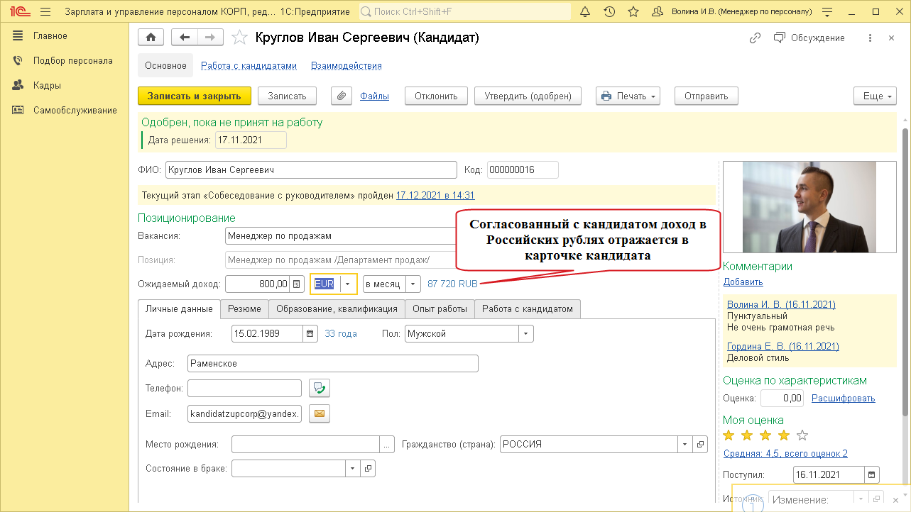 При регистрации нового кандидата в карточке отражаются его ожидания по зарплате в Российских рублях или иной валюте. Программа автоматически пересчитывает ожидания в валюте в рубли по текущему курсу.